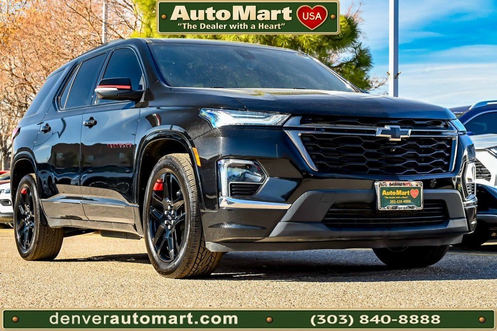 Traverse Premier, 4D Sport Utility, 3.6L V6 SIDI VVT, 9-Speed Automatic, AWD, Mosaic Black Metallic, Jet Black w/Perforated Leather-Appointed Seat Trim, CLEAN ONE OWNER CARFAX, CLEAN CARFAX, APPLE/ANDROID CAR PLAY, BLUETOOTH, IPOD/USB ADAPTER, MP3, PUSH START ENGINE, AWD, THIRD ROW SEATING, Backup Camera, Traverse Premier, 4D Sport Utility, 3.6L V6 SIDI VVT, 9-Speed Automatic, AWD, Mosaic Black Metallic, Jet Black w/Perforated Leather-Appointed Seat Trim, 10 Speakers, 1st & 2nd Row All-Weather Floor Liner (LPO), 3rd Row All-Weather Floor Liner (LPO), 3rd row seats: split-bench, 6-Way Power Front Passenger Seat, 8-Way Power Driver Seat Adjuster, Air Conditioning, AM/FM radio: SiriusXM with 360L, Apple CarPlay/Android Auto, Auto High-beam Headlights, Auto-dimming door mirrors, Auto-dimming Rear-View mirror, Automatic temperature control, Black Bowtie, Black Door Handles, Black Roof Rails, Bose Premium 10-Speaker Audio System Feature, Dual SkyScape 2-Panel Power Sunroof, Electronic Stability Control, Exterior Parking Camera Rear, Floor Liner Package (LPO), Front License Plate Bracket Mounting Package, Fully automatic headlights, Garage door transmitter, Heated 2nd Row Outboard Position Seats, Heated Driver & Front Passenger Seats, Heated steering wheel, Integrated Cargo Liner (LPO), Leather steering wheel, Navigation System, Ornamentation, Perforated Leather-Appointed Seat Trim, Power Liftgate, Preferred Equipment Group 1LZ, Premium audio system: Chevrolet Infotainment 3 Plus, Rear window defroster, Redline Accent Decals (LPO), Redline Edition, Remote keyless entry, SiriusXM w/360L, Steering wheel memory, Steering wheel mounted audio controls, Ventilated Driver & Front Passenger Seats, Wheels: 20" Gloss Black Painted Alum w/Red Stripes, 3.49 Axle Ratio, 4-Wheel Disc Brakes, ABS brakes, Brake assist, Bumpers: body-color, Compass, Delay-off headlights, Driver door bin, Driver vanity mirror, Dual front impact airbags, Dual front side impact airbags, Emergency communication system, Four wheel independent suspension, Front anti-roll bar, Front Bucket Seats, Front Center Armrest, Front dual zone A/C, Front Passenger 2-Way Power Lumbar, Front reading lights, Heated door mirrors, Heated front seats, Heated rear seats, Illuminated entry, Low tire pressure warning, Memory seat, Not Equipped w/Rear Park Assist (060), Occupant sensing airbag, Outside temperature display, Overhead airbag, Overhead console, Panic alarm, Passenger door bin, Passenger vanity mirror, Power door mirrors, Power Driver Lumbar Control, Power driver seat, Power passenger seat, Power steering, Power windows, PREMIUM WHEELS, Radio data system, Radio: Chevrolet Infotainment 3 Plus System w/Navi, Rear air conditioning, Rear anti-roll bar, Rear reading lights, Rear window wiper, Security system, Speed control, Speed-sensing steering, Spoiler, Tachometer, Telescoping steering wheel, Tilt steering wheel, Traction control, Trip computer, Turn signal indicator mirrors, Variably intermittent wipers, Ventilated front seats, Voltmeter, Wheels: 20" Metallic Machined-Face Aluminum, 10 Speakers, 1st & 2nd Row All-Weather Floor Liner (LPO), 3rd Row All-Weather Floor Liner (LPO), 3rd row seats: split-bench, 6-Way Power Front Passenger Seat, 8-Way Power Driver Seat Adjuster, Air Conditioning, AM/FM radio: SiriusXM with 360L, Apple CarPlay/Android Auto, Auto High-beam Headlights, Auto-dimming door mirrors, Auto-dimming Rear-View mirror, Automatic temperature control, Black Bowtie, Black Door Handles, Black Roof Rails, Bose Premium 10-Speaker Audio System Feature, Dual SkyScape 2-Panel Power Sunroof, Electronic Stability Control, Exterior Parking Camera Rear, Floor Liner Package (LPO), Front License Plate Bracket Mounting Package, Fully automatic headlights, Garage door transmitter, Heated 2nd Row Outboard Position Seats, Heated Driver & Front Passenger Seats, Heated steering wheel, Integr