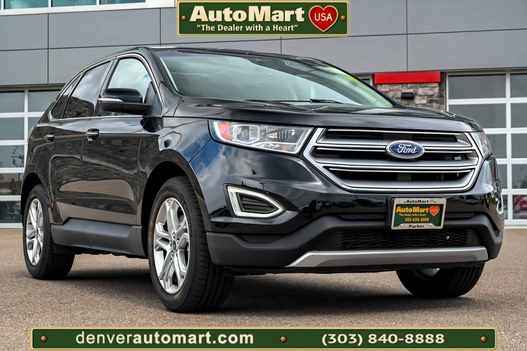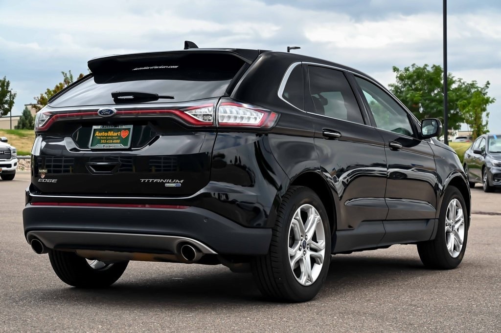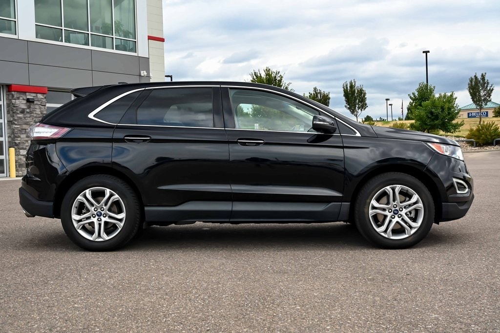 Edge Titanium, 4D Sport Utility, EcoBoost 2.0L I4 GTDi DOHC Turbocharged VCT, 6-Speed Automatic, AWD, Shadow Black, Ebony Leather, CLEAN CARFAX, APPLE/ANDROID CAR PLAY, BLUETOOTH, IPOD/USB ADAPTER, MP3, PUSH START ENGINE, AWD, Audio Package, Backup Camera, Edge Titanium, 4D Sport Utility, EcoBoost 2.0L I4 GTDi DOHC Turbocharged VCT, 6-Speed Automatic, AWD, Shadow Black, Ebony Leather, 12 Speakers, AM/FM radio: SiriusXM, AM/FM Stereo w/Single CD Player, Apple CarPlay/Android Auto, CD player, Emergency communication system: SYNC 3 911 Assist, Exterior Parking Camera Rear, Garage door transmitter, Heated front seats, Illuminated entry, Leather-Trimmed Heated Sport Bucket Seats, Navigation System, Premium audio system: Sony, PREMIUM WHEELS, Rear Parking Sensors, Remote keyless entry, Security system, SiriusXM Radio, Spoiler, Steering wheel mounted audio controls, SYNC 3 Communications & Entertainment System, 3.36 Axle Ratio, 4-Wheel Disc Brakes, ABS brakes, Air Conditioning, Auto-dimming Rear-View mirror, Automatic temperature control, Brake assist, Bumpers: body-color, Compass, Delay-off headlights, Driver door bin, Driver vanity mirror, Dual front impact airbags, Dual front side impact airbags, Electronic Stability Control, Four wheel independent suspension, Front anti-roll bar, Front Bucket Seats, Front Center Armrest w/Storage, Front dual zone A/C, Front reading lights, Fully automatic headlights, Heated door mirrors, Knee airbag, Leather Shift Knob, Low tire pressure warning, Memory seat, Occupant sensing airbag, Outside temperature display, Overhead airbag, Overhead console, Panic alarm, Passenger door bin, Passenger vanity mirror, Power door mirrors, Power driver seat, Power Liftgate, Power passenger seat, Power steering, Power windows, Rear anti-roll bar, Rear reading lights, Rear seat center armrest, Rear window defroster, Rear window wiper, Speed control, Speed-Sensitive Wipers, Split folding rear seat, Tachometer, Telescoping steering wheel, Tilt steering wheel, Traction control, Trip computer, Turn signal indicator mirrors, Variably intermittent wipers, Wheels: 19" Nickel-Painted Aluminum, 12 Speakers, AM/FM radio: SiriusXM, AM/FM Stereo w/Single CD Player, Apple CarPlay/Android Auto, CD player, Emergency communication system: SYNC 3 911 Assist, Exterior Parking Camera Rear, Garage door transmitter, Heated front seats, Illuminated entry, Leather-Trimmed Heated Sport Bucket Seats, Navigation System, Premium audio system: Sony, PREMIUM WHEELS, Rear Parking Sensors, Remote keyless entry, Security system, SiriusXM Radio, Spoiler, Steering wheel mounted audio controls, SYNC 3 Communications & Entertainment System.