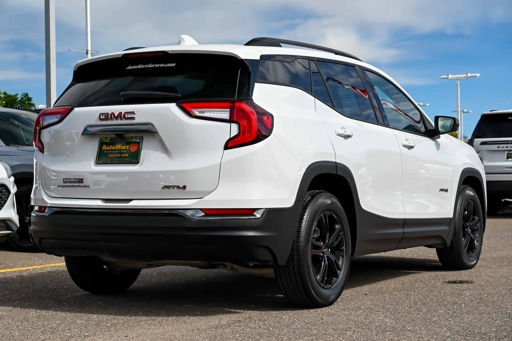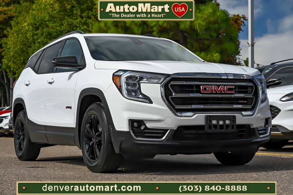 Terrain AT4, 4D Sport Utility, 1.5L DOHC, 9-Speed Automatic, AWD, Summit White, Jet Black w/Perforated Leather-Appointed Seat Trim, CLEAN ONE OWNER CARFAX, CLEAN CARFAX, APPLE/ANDROID CAR PLAY, BLUETOOTH, IPOD/USB ADAPTER, MP3, AWD, Audio Package, Backup Camera, Terrain AT4, 4D Sport Utility, 1.5L DOHC, 9-Speed Automatic, AWD, Summit White, Jet Black w/Perforated Leather-Appointed Seat Trim, 2 USB Data Ports, 2 USB Data Ports w/SD Card Reader, 4-Wheel Disc Brakes, 6 Speakers, 6-Speaker Audio System Feature, 6-Way Power Front Passenger Seat, 8-Way Power Driver Seat Adjuster, ABS brakes, Air Conditioning, AM/FM radio: SiriusXM, Auto High-beam Headlights, Auto-dimming Rear-View mirror, Automatic temperature control, Bluetooth® For Phone, Brake assist, Bumpers: body-color, Compass, Delay-off headlights, Driver & Front Passenger Heated Seats, Dual front impact airbags, Dual front side impact airbags, Electronic Stability Control, Emergency communication system: OnStar and GMC connected services capable, Four wheel independent suspension, Front anti-roll bar, Front Center Armrest, Front dual zone A/C, Front fog lights, Front Passenger 2-Way Power Lumbar, Front reading lights, Fully automatic headlights, Garage door transmitter, Heated door mirrors, Heated front seats, Heated steering wheel, Illuminated entry, Lane Departure Warning System, License Plate Front Mounting Package, Memory seat, Occupant sensing airbag, Outside temperature display, Panic alarm, Passenger vanity mirror, Perforated Leather-Appointed Seat Trim w/AT4 Logo, Power door mirrors, Power Driver Lumbar Control, Power driver seat, Power Liftgate, Power passenger seat, Power windows, Preferred Equipment Group 4SC, Radio data system, Radio: GMC Infotainment Audio System w/8" Display, Rear anti-roll bar, Rear seat center armrest, Rear window defroster, Remote keyless entry, Roof rack: rails only, Security system, SiriusXM Radio, Speed control, Split folding rear seat, Spoiler, Steering wheel mounted audio controls, Traction control, Turn signal indicator mirrors, Wireless Apple CarPlay/Wireless Android Auto, 3.47 Axle Ratio, Deleted 3 Years of OnStar & Connected Services Plan, Driver door bin, Driver vanity mirror, Front Bucket Seats, Low tire pressure warning, Overhead airbag, Overhead console, Passenger door bin, Power steering, PREMIUM WHEELS, Rear window wiper, Speed-sensing steering, Tachometer, Telescoping steering wheel, Tilt steering wheel, Trip computer, Variably intermittent wipers, Wheels: 17" x 7" Gloss Black Aluminum, 2 USB Data Ports, 2 USB Data Ports w/SD Card Reader, 4-Wheel Disc Brakes, 6 Speakers, 6-Speaker Audio System Feature, 6-Way Power Front Passenger Seat, 8-Way Power Driver Seat Adjuster, ABS brakes, Air Conditioning, AM/FM radio: SiriusXM, Auto High-beam Headlights, Auto-dimming Rear-View mirror, Automatic temperature control, Bluetooth® For Phone, Brake assist, Bumpers: body-color, Compass, Delay-off headlights, Driver & Front Passenger Heated Seats, Dual front impact airbags, Dual front side impact airbags, Electronic Stability Control, Emergency communication system: OnStar and GMC connected services capable, Four wheel independent suspension, Front anti-roll bar, Front Center Armrest, Front dual zone A/C, Front fog lights, Front Passenger 2-Way Power Lumbar, Front reading lights, Fully automatic headlights, Garage door transmitter, Heated door mirrors, Heated front seats, Heated steering wheel, Illuminated entry, Lane Departure Warning System, License Plate Front Mounting Package, Memory seat, Occupant sensing airbag, Outside temperature display, Panic alarm, Passenger vanity mirror, Perforated Leather-Appointed Seat Trim w/AT4 Logo, Power door mirrors, Power Driver Lumbar Control, Power driver seat, Power Liftgate, Power passenger seat, Power windows, Preferred Equipment Group 4SC, Radio data system, Radio: GMC Infotainment Audio System w/8" Display, Rear anti-roll