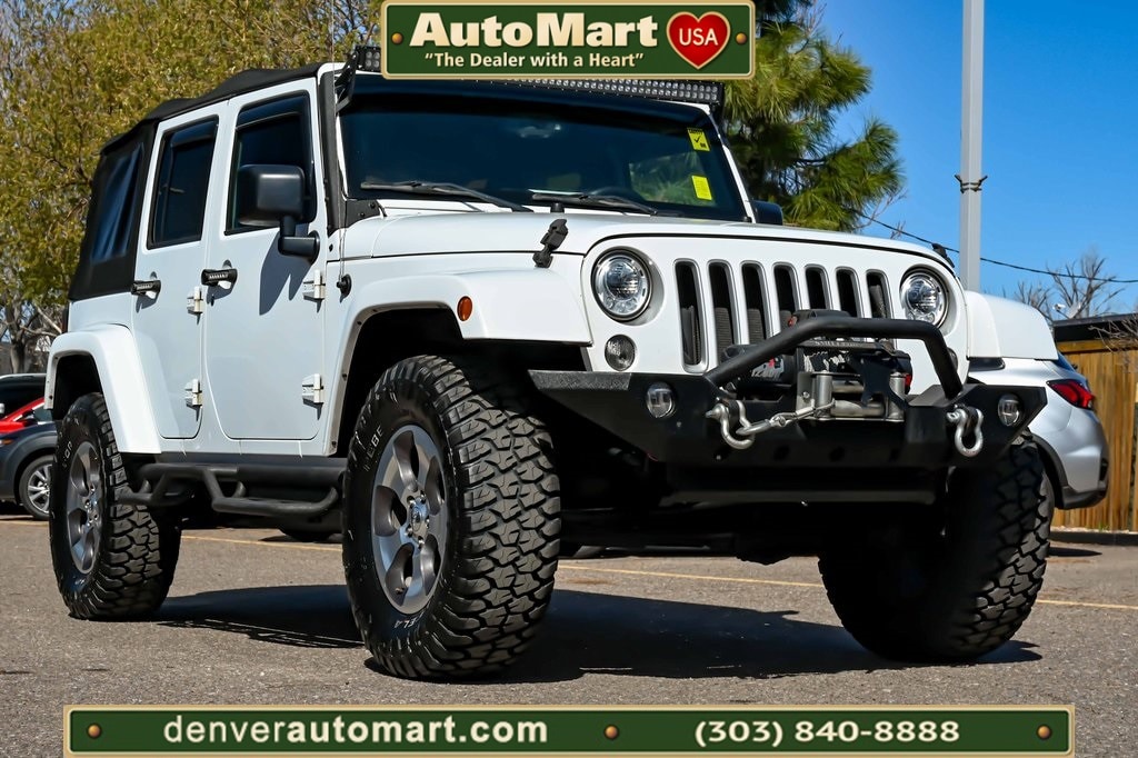 Wrangler Unlimited Sahara, 4D Sport Utility, 3.6L V6 24V VVT, 6-Speed Manual, 4WD, Bright White Clearcoat, Black w/Cloth Seats w/Adjustable Head Restraints or Leather Trimmed Bucket Seats or Recon Leather Seats, CLEAN CARFAX, APPLE/ANDROID CAR PLAY, BLUETOOTH, IPOD/USB ADAPTER, MP3, 4X4, Backup Camera, Wrangler Unlimited Sahara, 4D Sport Utility, 3.6L V6 24V VVT, 6-Speed Manual, 4WD, Bright White Clearcoat, Black w/Cloth Seats w/Adjustable Head Restraints or Leather Trimmed Bucket Seats or Recon Leather Seats, 4-Wheel Disc Brakes, 8 Speakers, Air Conditioning, AM/FM radio: SiriusXM, Audio Jack Input for Mobile Devices, Auto-dimming Rear-View mirror, Body Color Appliques Front Bumper, Body Color Appliques Rear Bumper, Body Color/Accent Color Grille, Brake assist, CD player, Cloth Seats w/Adjustable Head Restraints, Compass, Connectivity Group, Driver vanity mirror, Electronic Stability Control, Front anti-roll bar, Front Bucket Seats, Front Center Armrest w/Storage, Front fog lights, Front reading lights, Fully automatic headlights, Heated door mirrors, Heavy Duty Suspension w/Gas Shocks (DISC), Illuminated entry, Integrated roll-over protection, Leather steering wheel, Low tire pressure warning, Manufacturer's Statement of Origin, Outside temperature display, Panic alarm, Passenger door bin, Passenger vanity mirror, Power door mirrors, Power steering, Power windows, Premium Black Sunrider Soft Top, Quick Order Package 23G, Radio data system, Radio: 130, Rear anti-roll bar, Remote keyless entry, Remote USB Port, Security system, Speed control, Split folding rear seat, Steering wheel mounted audio controls, Tachometer, Tire Pressure Monitoring Display, Traction control, Trip computer, Uconnect Voice Command w/Bluetooth, Vehicle Information Center, 18" x 7.5" Polished Satin Carbon Wheels, 3.21 Rear Axle Ratio, ABS brakes, Driver door bin, Dual front impact airbags, Occupant sensing airbag, PREMIUM WHEELS, Tilt steering wheel, Variably intermittent wipers, 4-Wheel Disc Brakes, 8 Speakers, Air Conditioning, AM/FM radio: SiriusXM, Audio Jack Input for Mobile Devices, Auto-dimming Rear-View mirror, Body Color Appliques Front Bumper, Body Color Appliques Rear Bumper, Body Color/Accent Color Grille, Brake assist, CD player, Cloth Seats w/Adjustable Head Restraints, Compass, Connectivity Group, Driver vanity mirror, Electronic Stability Control, Front anti-roll bar, Front Bucket Seats, Front Center Armrest w/Storage, Front fog lights, Front reading lights, Fully automatic headlights, Heated door mirrors, Heavy Duty Suspension w/Gas Shocks (DISC), Illuminated entry, Integrated roll-over protection, Leather steering wheel, Low tire pressure warning, Manufacturer's Statement of Origin, Outside temperature display, Panic alarm, Passenger door bin, Passenger vanity mirror, Power door mirrors, Power steering, Power windows, Premium Black Sunrider Soft Top, Quick Order Package 23G, Radio data system, Radio: 130, Rear anti-roll bar, Remote keyless entry, Remote USB Port, Security system, Speed control, Split folding rear seat, Steering wheel mounted audio controls, Tachometer, Tire Pressure Monitoring Display, Traction control, Trip computer, Uconnect Voice Command w/Bluetooth, Vehicle Information Center.