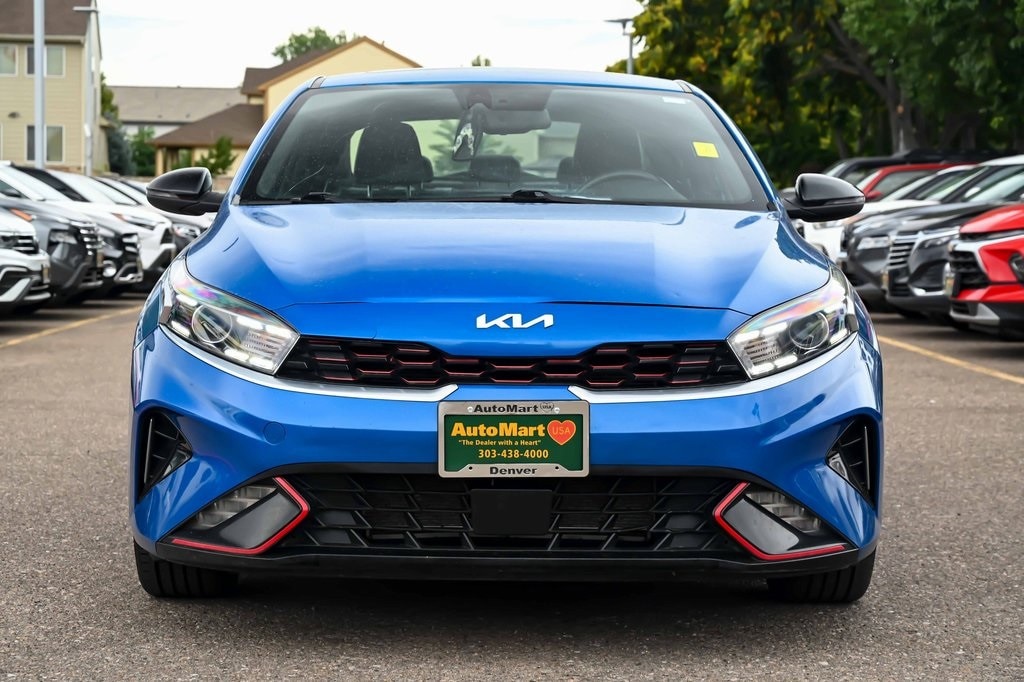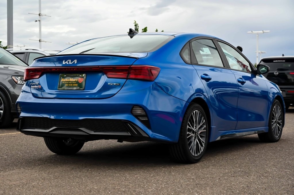 Forte GT-Line, 4D Sedan, 2.0L I4 MPI, CVT, FWD, Sporty Blue, Black, APPLE/ANDROID CAR PLAY, BLUETOOTH, IPOD/USB ADAPTER, MP3, PUSH START ENGINE, Audio Package, Backup Camera, Forte GT-Line, 4D Sedan, 2.0L I4 MPI, CVT, FWD, Sporty Blue, Black, 10-Way Power Driver's Seat, 6 Speakers, AM/FM radio: SiriusXM, Apple CarPlay & Android Auto, Electronic Parking Brake (EPB), Emergency communication system, Exterior Parking Camera Rear, Forward Collision Avoidance-Assist - Cyclist, GT-Line Premium Package, GT-Line Sport Premium Package, Heated & Ventilated Front Seats, Illuminated entry, LED Interior Lighting, Navigation System, Navigation-Based Smart Cruise Control (NSCC), Power Sunroof, PREMIUM WHEELS, Radio data system, Radio: 10.25" Display Audio, Radio: harman kardon Premium Audio, Rear AC Vent, Rear USB Charger, Remote keyless entry, Security system, Smart Cruise Control w/Stop & Go, Spoiler, Steering wheel mounted audio controls, SynTex Seat Trim, Wireless Charging, 17" x 7.0J Alloy Wheels, 4-Wheel Disc Brakes, ABS brakes, Air Conditioning, Auto High-beam Headlights, Automatic temperature control, Brake assist, Bumpers: body-color, Cloth & SynTex Seat Trim, Delay-off headlights, Driver door bin, Driver vanity mirror, Dual front impact airbags, Dual front side impact airbags, Electronic Stability Control, Front anti-roll bar, Front Bucket Seats, Front Center Armrest, Front dual zone A/C, Front fog lights, Front reading lights, Front wheel independent suspension, Fully automatic headlights, Heated door mirrors, Leather Shift Knob, Leather steering wheel, Low tire pressure warning, Occupant sensing airbag, Outside temperature display, Overhead airbag, Overhead console, Panic alarm, Passenger door bin, Passenger vanity mirror, Power door mirrors, Power steering, Power windows, Rear seat center armrest, Rear window defroster, Speed control, Split folding rear seat, Sport steering wheel, Tachometer, Telescoping steering wheel, Tilt steering wheel, Traction control, Trip computer, Turn signal indicator mirrors, Variably intermittent wipers, 10-Way Power Driver's Seat, 6 Speakers, AM/FM radio: SiriusXM, Apple CarPlay & Android Auto, Electronic Parking Brake (EPB), Emergency communication system, Exterior Parking Camera Rear, Forward Collision Avoidance-Assist - Cyclist, GT-Line Premium Package, GT-Line Sport Premium Package, Heated & Ventilated Front Seats, Illuminated entry, LED Interior Lighting, Navigation System, Navigation-Based Smart Cruise Control (NSCC), Power Sunroof, PREMIUM WHEELS, Radio data system, Radio: 10.25" Display Audio, Radio: harman kardon Premium Audio, Rear AC Vent, Rear USB Charger, Remote keyless entry, Security system, Smart Cruise Control w/Stop & Go, Spoiler, Steering wheel mounted audio controls, SynTex Seat Trim, Wireless Charging.